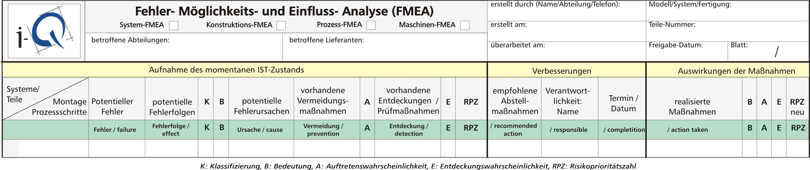 Zu diesen unterschiedlichen Vorgehensweisen liegen detaillierte Bewertungstabellen vor, so dass die Vergleichbarkeit der Analysen untereinander gewährleistet wird. Basis für diese i-Q Bewertungstabellen sind die Angaben der AIAG im entsprechenden "Blue Book" zur FMEA bzw. zur Maschinen-FMEA. Außerdem sind auch die Information der SAE, des VDA und natürlich seit dem Jahr 2018 auch der gemeinsame Band zur FMEA der AIAG und des VDA in diese Bewertungstabellen eingeflossen. Die Tabellen können im Downloadbereich kostenlos heruntergeladen werden.